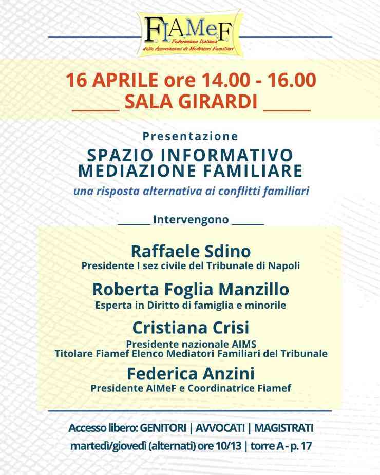 A Napoli presso la Sala Girardi del Tribunale di Napoli, giovedì 16 Aprile alle ore 14.00, sarà presentato lo Sportello sulla Mediazione Familiare. L’iniziativa rappresenta un passo importante per promuovere la cultura della mediazione familiare all’interno del sistema giustizia, favorendo percorsi che mettano al centro la responsabilità genitoriale e il benessere dei figli. La mediazione familiare è un percorso volontario e riservato che aiuta le coppie in fase di separazione a gestire il conflitto in modo costruttivo, favorendo accordi condivisi e tutelando il benessere dei figli. Cristiana Crisi, presidente nazionale AIMS e titolare Fiamef Elenco Mediatori Familiari del Tribunale, sottolinea che “la mediazione familiare rappresenta un percorso strutturato che aiuta i genitori a riorganizzare la relazione genitoriale dopo la separazione, favorendo il dialogo, la collaborazione e il rispetto dei bisogni dei figli”. I mediatori presenti nell’Elenco del Tribunale sono professionisti qualificati con almeno cinque anni di esperienza nel campo della mediazione familiare. Operano nel rispetto di quanto previsto dal D.M. 27 ottobre 2023 n. 151, attuativo della riforma Cartabia, che disciplina la figura professionale del mediatore familiare con i requisiti di formazione e gli obblighi di aggiornamento continuo. I mediatori offrono inoltre un primo incontro informativo completamente gratuito. La conferenza del nasce proprio con l’obiettivo di informare giudici, famiglie e avvocati sulle regole, i principi e le potenzialità della mediazione familiare, promuovendo una cultura della gestione pacifica dei conflitti familiari. Lo sportello informativo della FIAMEF è attivo i martedì e i giovedi, alternati, dalle 10 alle 13 presso il Tribunale di Napoli, al piano 17 della Torre A. Alla presentazione parteciperanno Raffaele Sdino presidente I sez civile del Tribunale di Napoli, Roberta Foglia Manzillo, esperta in Diritto di famiglia e minorile, Cristiana Crisi, presidente nazionale AIMS e titolare Fiamef Elenco Mediatori Familiari del Tribunale, e Federica Anzini, presidente AlMeF e Coordinatrice Fiamef.