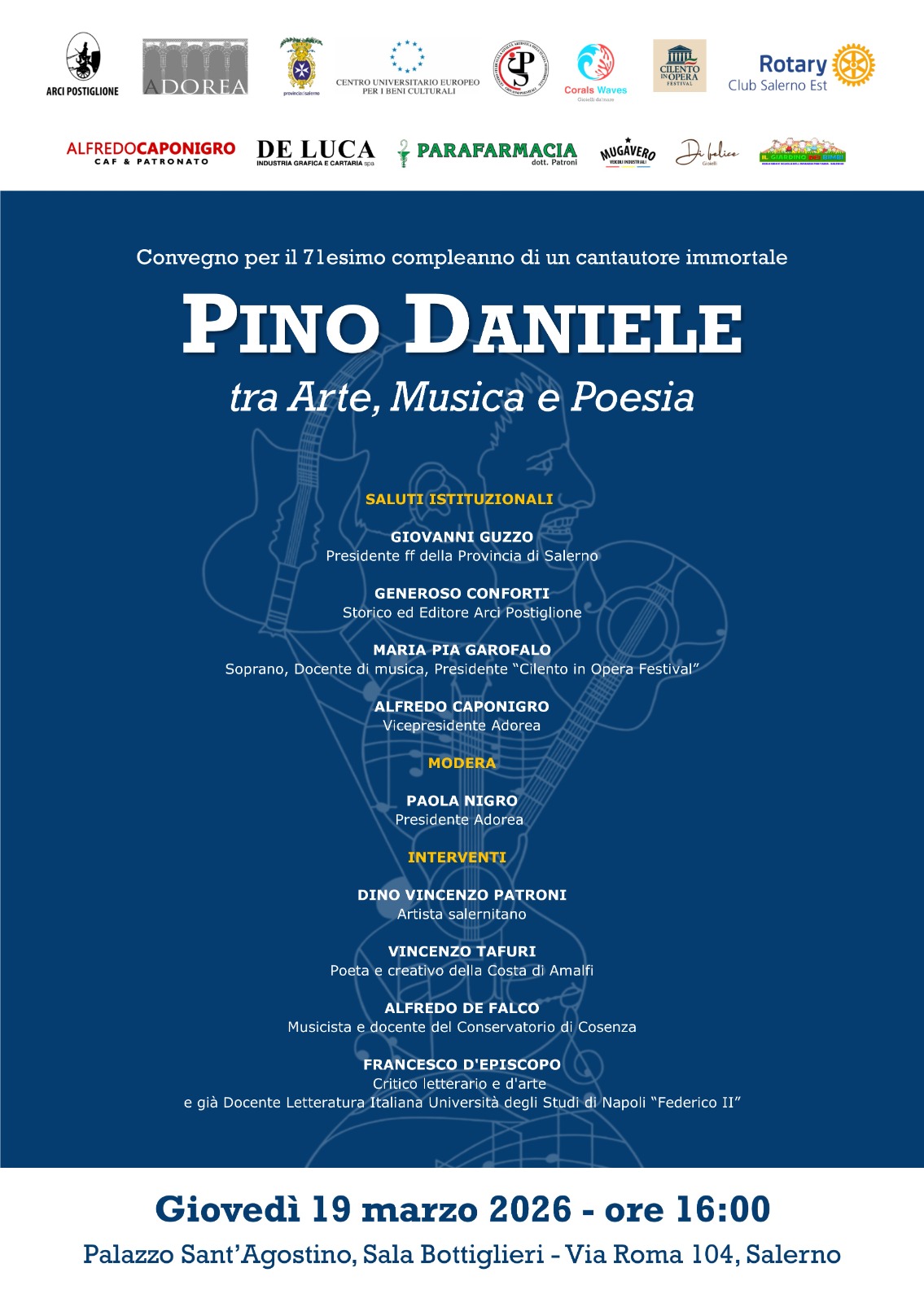 L’Associazione Culturale Adorea, in occasione del 71mo compleanno dell’indimenticato Pino Daniele e in considerazione della immortalità della sua musica, promuove un convegno ideato dall’artista Dino Vincenzo Patroni e dal poeta Vincenzo Tafuri . L’appuntamentoè per Giovedì 19 Marzo (data del compleanno del musicista napoletano scomparso nel 2015) presso la Sala Bottiglieri di Palazzo S. Agostino in Via Roma 104 a Salerno. La manifestazione in memoria del geniale compositore avrà inizio a partire dalle ore 16.00 alla presenza della stampa, di musicisti, di cantanti, di esperti e di intellettuali e studiosi.