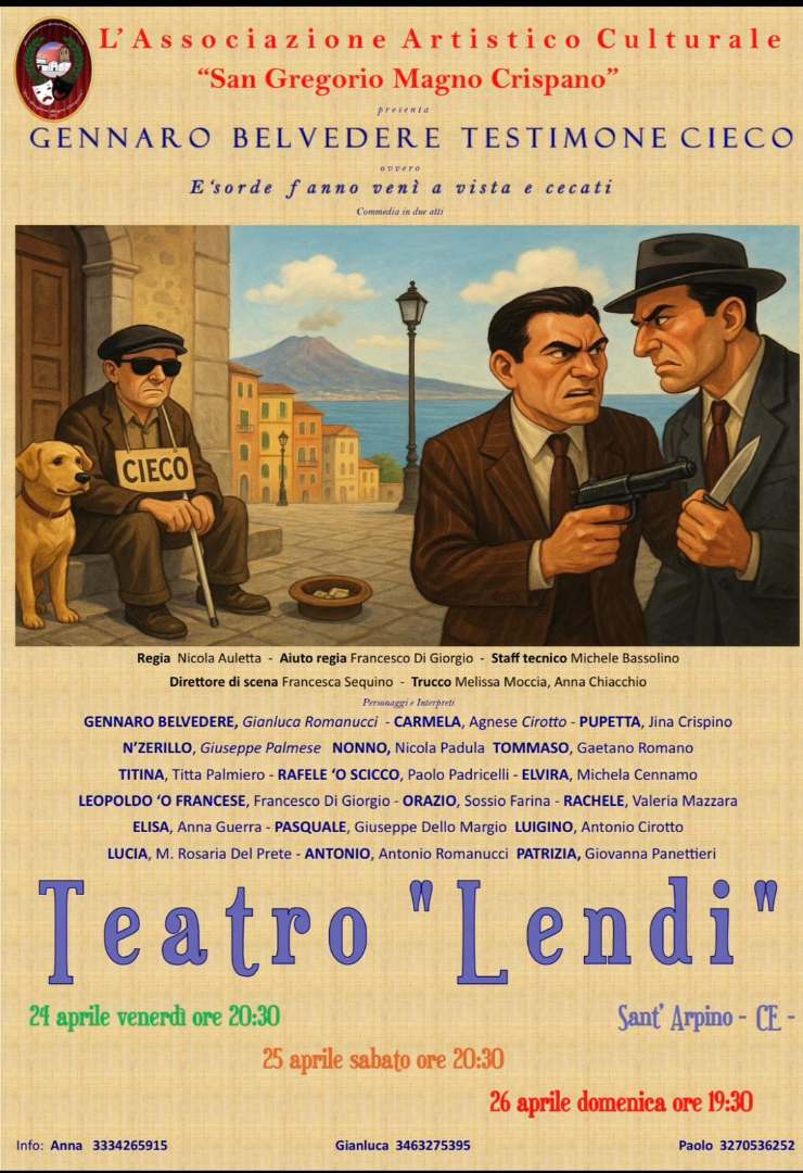 L’Associazione Artistico Culturale “San Gregorio Magno”, realtà storica di Crispano impegnata nella promozione del teatro e della cultura locale, annuncia il debutto dell’esilarante commedia in due atti: “Gennaro Belvedere Testimone Cieco”. Presso il teatro Lendi di