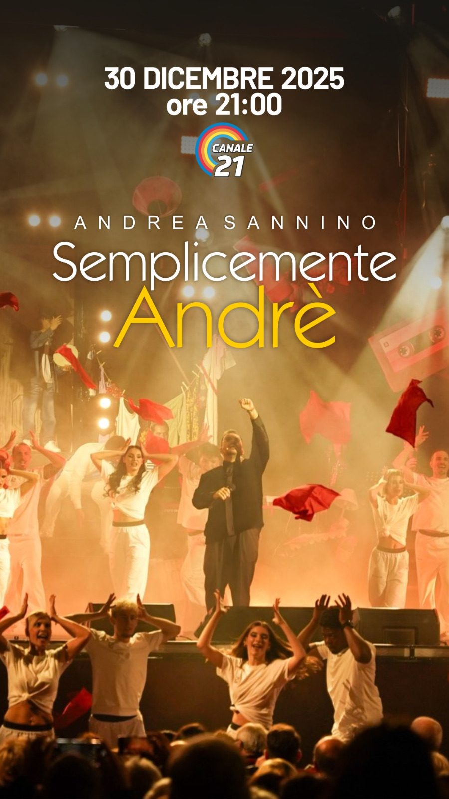 Questa sera, su Canale 21 alle ore 21, va in onda “Semplicemente Andrè”, il concerto-recital di Andrea Sannino. L’artista, insieme alla regia di Donato Eremita e alla direzione musicale di Mauro Spenillo, trasforma il palcoscenico in un salotto familiare, per raccontare la sua infanzia in una casa di 25 metri quadri, dove si stava stretti ma si sognava tanto.