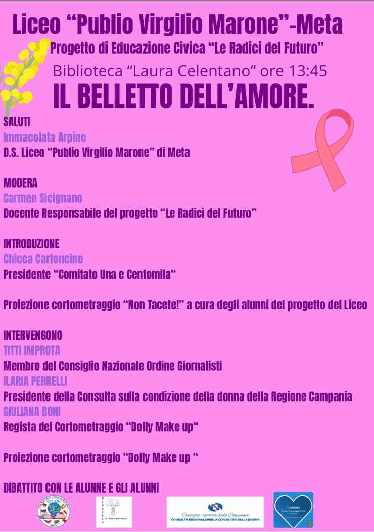 Domani alle 13.45, si terrà il primo incontro al liceo Virgilio Marone di Meta di Sorrento, promosso insieme al Comitato Una e Centomila di Vico Equense, presieduto da Chicca Cartoncino.